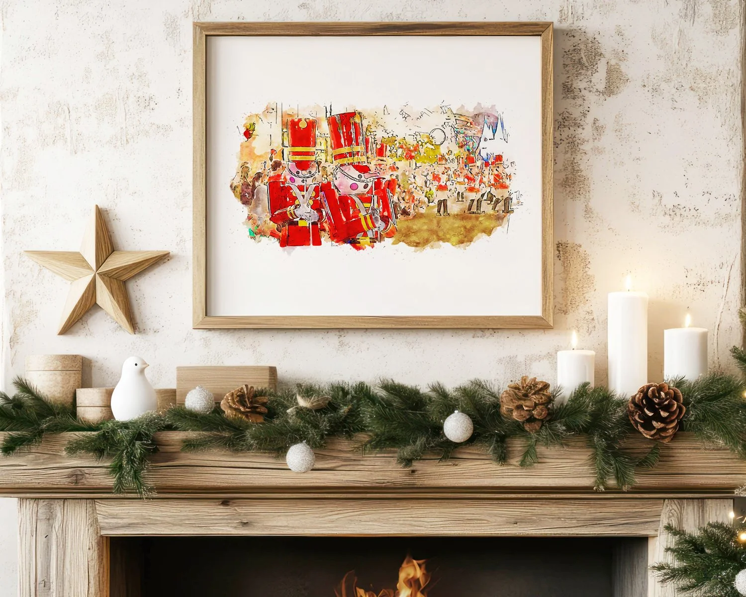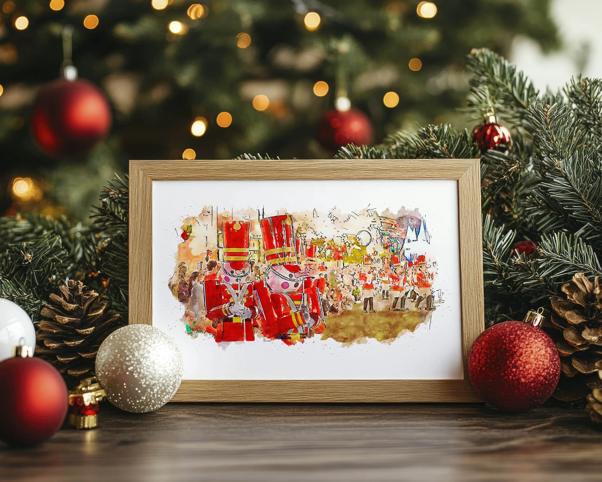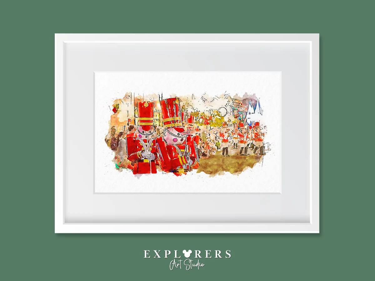We curated this piece of art using our own photograph captured during a festive trip to Walt Disney World's Magic Kingdom during the Christmas season. The Toy Soldiers scene in Mickey's Once Upon a Christmastime Parade is one of our most favourite highlights, watching them parade through Mainstreet USA!